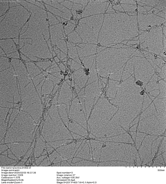 Microscopía electrónica de trasmisión (MET): Para determinar el tamaño de las fibras de nanocelulosa uilizamos un Microscopio Electrónico de Transmisión HITACHI HT 7700 del Centro de Investigación en Estructuras Microscópicas (CIEMic) de la Universidad de Costa.