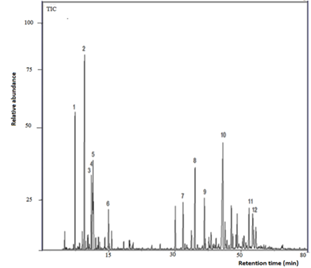 Gas chromatography-mass spectrometry (GC-MS): GC-MS analyses were performed with a Shimadzu GC-2010 Plus gas chromatograph coupled with a GCMS-QP2010 SE apparatus and with GCMSsolution™ software (version 4.20), with NIST and Wiley 139 computerized databases. The analyzes were performed with two fused-silica-capillary columns with stationary phases of different polarities: 1,4-bis(dimethylsiloxy) phenylene dimethylpolysiloxane and polyethylene glycol. The data were obtained with a non-polar SLB™-5ms (Supelco) fused silica column (30m x 0,25mm; film thickness 0,25μm). Operating conditions were: carrier gas He, flow 1,4 mL min-1 with constant pressure; oven temperature was programmed linearly from 60°C to 280°C at 3°C min-1; sample injection port temperature 250°C; interface temperature 260°C; ionization voltage: 70 eV; ionization current 60μA; scanning speed 0,30s over 35 to 400 amu range; split 1:70. Also, the data were obtained with a second polar Supelcowax™10 (Supelco) fused silica column (30m x 0,25mm; film thickness 0,2 μm). Operating conditions were carrier gas He, flow 1,4mL min-1; oven temperature program: 60–220°C at 3°C min-1; sample injection port temperature 240°C; transfer line temperature 230°C; ionization voltage: 70 eV; ionization current 60 μA; scanning speed 0,30s over acquisition mass range, 35 to 400 amu; split 1:70.