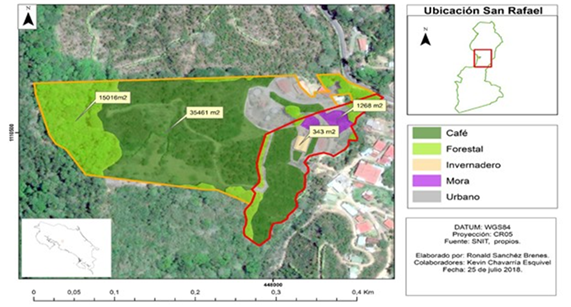 En Rincón de Mora se presenta una precipitación de 3461mm por año, con una temperatura promedio de 20°C y una humedad relativa de 92% (Centro de Investigaciones Geofísicas [CIGEFI], 2019). El uso de suelo de las fincas es de 3,5ha en agroecosistema con café, 1,5ha de bosque en regeneración que colinda con un bosque secundario, 1266m2 de cultivo de Rubus spectabilis (Pursh) (mora), un invernadero de 343m2 y el área restante 1266m2 corresponde a construcciones, entre ellos un estanque (Fig. 1).