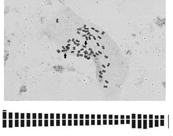 The following variables were evaluated: total chromosome length (c), long arm length (l), short arm length (s), centromeric index (ci), total complement length (TCL), mean chromosome length (cme), maximum and minimum chromosome length (c max, c min). Chromosomes were classified according to the methodology proposed by Levan et al., (1964), inter- and intrachromosomal asymmetries were calculated according to Romero (1986), and the criterion of Bataglia (1955) was used for the description of satellites. For the elaboration of the karyotype and idiogram, seven metaphase plates with well extended chromosomes were considered.