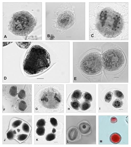 In the second stage of meiotic division, PMCs in MII presented chromosomes outside the equatorial plate in 8% of them (Fig. 3G) and the formation of perpendicular spindles in 2% of them, whereas in AII and TII lagging chromosomes were observed in 2% of them. During spore formation, 1,47% triads (Fig. 3I), 81,54% tetrads (Fig. 3H), 15,86% pentads (Fig. 3K), 1,10% hexads with microspores and micronuclei (Fig. 3J) were recorded. Cytoplasmic channel formation was observed between spores. PMCs without cellular content were recorded throughout the division (Fig. 3L). Seventy percent of the pollen grains were viable; the rest were smaller and nonviable (Fig. 3M).