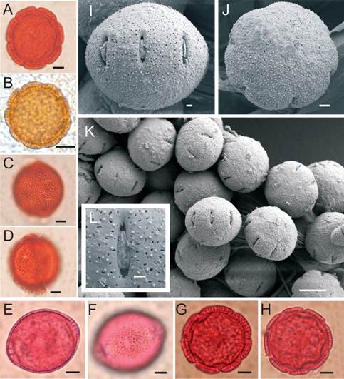 Fig. 4. Pollen grains on Borreria spinosa. A-D Nonacetolysed pollen. A) Equatorial view in optical section. B) Equatorial view on surface. C) Polar view in 8-colporate optical section. D) Polar view in 7-colporate surface. E-H Acetolysed pollen. E) Polar view in 9-colporate optical section. F) Polar view in 7-colporate optical section. G and H) Equatorial view on surface. I-L MEB. I) Equatorial view. J) Polar view. K) General view of the grains. L) Detail of aperture and surface. Scale 5µm