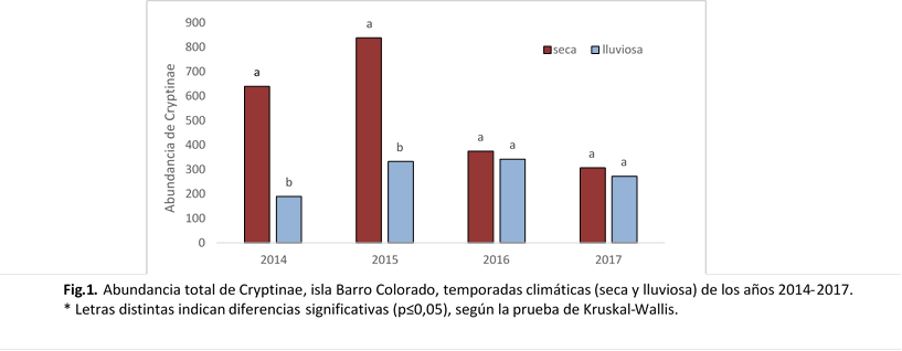 En términos generales, se registró una abundancia significativamente mayor de Cryptinae durante la temporada seca en comparación con la lluviosa (Tabla 2.) (p = 0,002, prueba de Wilcoxon). El análisis de las temporadas específicas de cada año de recolección reveló que las temporadas lluviosas no presentaron diferencias significativas entre sí (p = 0,3176). En contraste, las temporadas secas mostraron diferencias significativas (p = 0,007), con variaciones notables entre la temporada seca de 2015 y las de los 2016 y 2017 (p= 0,048); exhibiendo una abundancia significativamente mayor durante la temporada seca 2015.