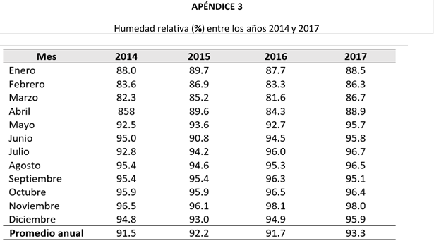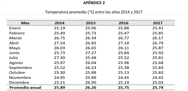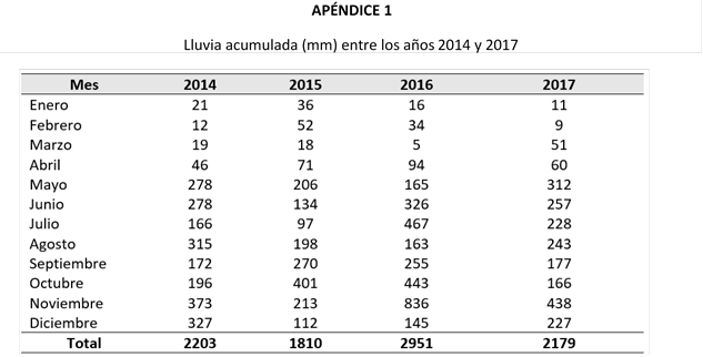 Con respecto a los datos climáticos (Tabla 3), el año 2015 registró las temperaturas más altas, así como el menor registro de precipitaciones. En contraste, el año 2016 presentó la mayor precipitación entre todos los años analizados.