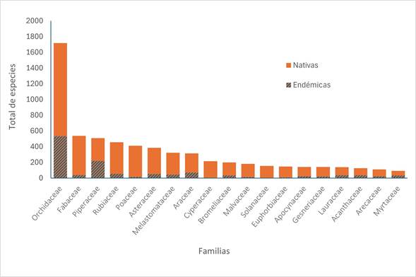 El endemismo varía considerablemente entre los grupos taxonómicos, así como entre las formas de crecimiento. Si bien en el país las dicotiledóneas superan a las monocotiledóneas en el total de especies nativas en una proporción de 2:1, a nivel de especies endémicas la relación no se mantiene y las monocotiledóneas presentan en proporción una mayor riqueza de especies endémicas. Algunas familias y géneros superan en cuanto al número de especies endémicas a la mayoría de las restantes familias y géneros, que registran de 4 a 0 especies endémicas. Paradójicamente algunas familias y géneros con poca riqueza presentan los mayores porcentajes de endemismo. Esto de alguna manera se sustenta con lo observado en la filogenia, en la que algunos grupos muestran mayor tendencia al endemismo y este no es homogéneo ni generalizado. Estos resultados son coincidentes con los obtenidos por Carmona-Higuita et al. (2024) para cinco familias de epífitas en el Neotrópico. Entre las formas de crecimiento sobresalen las hierbas más que otros tipos, aspecto que también se observa a nivel de la flora nacional (Nivia & Cascante, 2008), debido mayormente al alto aporte de la familia Orchidaceae y otras monocotiledóneas, caracterizadas por presentar este tipo de forma de crecimiento.