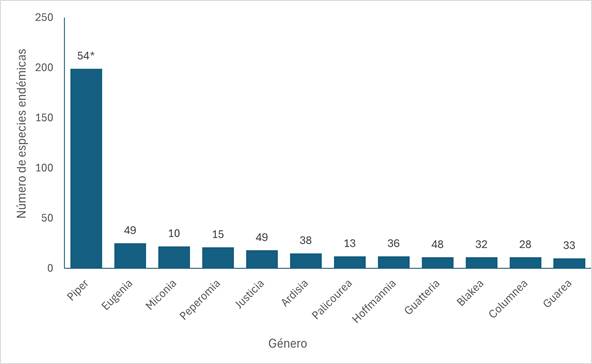 Algunas de las familias que registran mayor número de especies endémicas como Orchidaceae, Piperaceae, Araceae, Rubiaceae, están también entre las que presentan más riqueza de especies en el país (Hammel et al., 2004; Nivia & Cascante, 2008; Pupulin et al., 2023), y aunque este patrón se ha reportado para otras regiones y países (Beard et al., 2000; Nivia & Cascante, 2008; Texier et al., 2022), no parece ser una relación directa, ya que familias con alta riqueza de especies en Costa Rica como Poaceae, Cyperaceae y Solanaceae, no registran un endemismo significativo y otras como Acanthaceae, Myrtaceae y Lauraceae, que no figuran entre las 10 familias con mayor riqueza de especies en Costa Rica, si presentan un nivel de endemismo importante. A nivel genérico sucede algo similar, algunos géneros con alta riqueza de especies nativas también presentan alto endemismo, aunque otros como Telipogon y Eugenia, que no destacan por su riqueza de especies en Costa Rica, registran un endemismo importante. A la vez, existen géneros monoespecíficos o con pocas especies en el país, que presentan significativo endemismo.