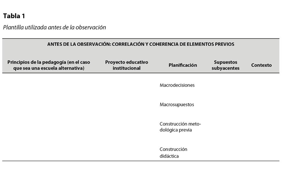 En definitiva, todos los constructos anteriores confluyen en una propuesta de instrumento de observación, dividida en tres secciones: la primera de ellas, asociada a los momentos previos de la observación basada en el análisis del proyecto educativo institucional del establecimiento y la planificación docente, cuyo objetivo será recoger información, previo al abordaje empírico: tales como las macrodecisiones; los macrosupuestos; las características de la construcción metodológica propuesta por el profesorado en la planificación de aula; la construcción didáctica asociada a la relación entre contenido y método dilucidando la diversidad de enfoques y propuestas; los supuestos básicos subyacentes, que tienen que ver con los significados y las posturas frente a la práctica y la teoría; y, finalmente, la consideración de los elementos contextuales referidos al lugar, la institución, la población, entre otros elementos.