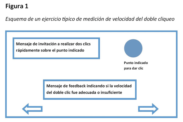 Dentro de las actividades introductorias al uso del mouse, fue de especial interés la actividad del doble cliqueo. En la Figura 1, se detalla un esquema típico de una aplicación para evaluar el doble cliqueo: un objetivo de cliqueo, un mensaje indicando al usuario el lugar donde debe dar el doble clic y un mensaje de feedback que informa al usuario si su velocidad de cliqueo es adecuada o insuficiente (el diseño multimedia puede variar, por ejemplo: los gráficos, si se utiliza sonido, o la posición de los componentes en la pantalla). Lo notable es que un 95% de los estudiantes mostró dificultad al realizarla. Debe hacerse notar que esta dificultad solo puede advertirse por medio de aplicaciones específicas: un profesor, a simple vista, no puede saber si el operador de la computadora está dando el clic a la velocidad adecuada.