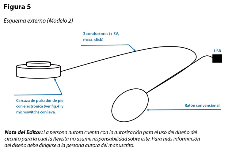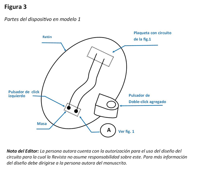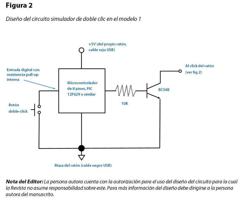 Como un paliativo al problema planteado, durante el primer año, se diseñó en colaboración con un ingeniero electrónico un dispositivo eléctrico/electrónico de bajo costo, anexado a un mouse de computadora para facilitar la utilización del mouse, el cual se denominó “simulador de doble clic”. Este botón simula un doble clic cuando los usuarios lo pulsan una sola vez (modelo 1). Posteriormente, se diseñó un botón pulsador más grande separado del mouse, previendo que algunas personas tienen mayores limitaciones en la pulsación, para que solo dieran un golpe (modelo 2).