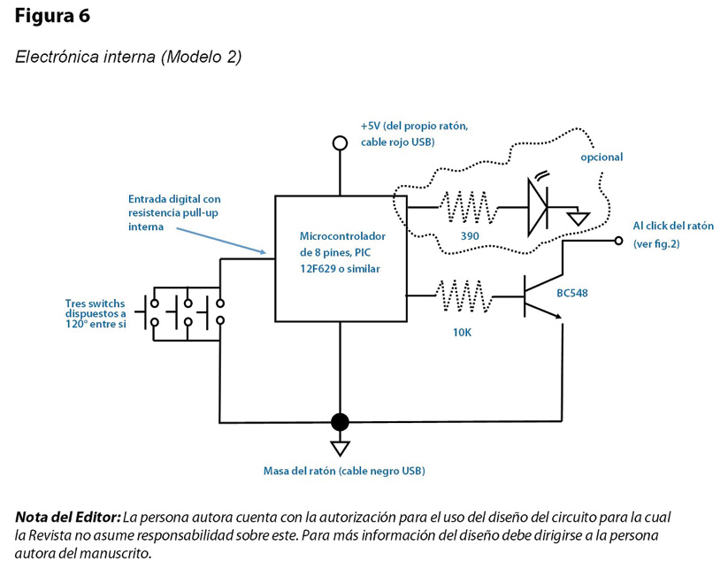 El diseño se realizó con materiales accesibles y una electrónica sencilla, de manera que pudiera ser replicado por cualquier persona con conocimientos técnicos suficientes que dispusiera de los planos de construcción. Los planos, registrados en el INPI (Instituto Nacional de la Propiedad Industrial, acta 20210103453, a publicarse en el boletín de septiembre de 2023 como plazo máximo estimado) se pusieron a disposición de los estudiantes. El informe de búsqueda internacional del INPI reveló que no existen antecedentes coincidentes, aunque sí versiones extranjeras de otro tipo de emuladores de mayor sofisticación y costo utilizadas especialmente para juegos (tanto los planos como el informe pueden solicitarse al mail del autor). La institución donde se llevó adelante la investigación (comprendía un centro de idiomas e informática abierto a la comunidad y cuatro niveles educativos, desde inicial a terciario) proveyó los materiales necesarios para la actividad de fabricación de los pulsadores, la cual quedó a cargo del taller de electrónica de la escuela media. Se previeron dos variantes: en el primer modelo, al ratón convencional se le agrega un botón de doble-clic en un costado de la carcaza con una electrónica microprocesada alimentada del propio ratón, alojada en el interior del cuerpo del mismo, cuya función es que, al apretar una sola vez el botón de doble-clic, la electrónica genera un doble clic (dos pulsaciones rápidas) y no vuelve a generar otros pulsos hasta tanto se libere el botón y se lo vuelva a apretar nuevamente (Ver Figuras 2 y 3).