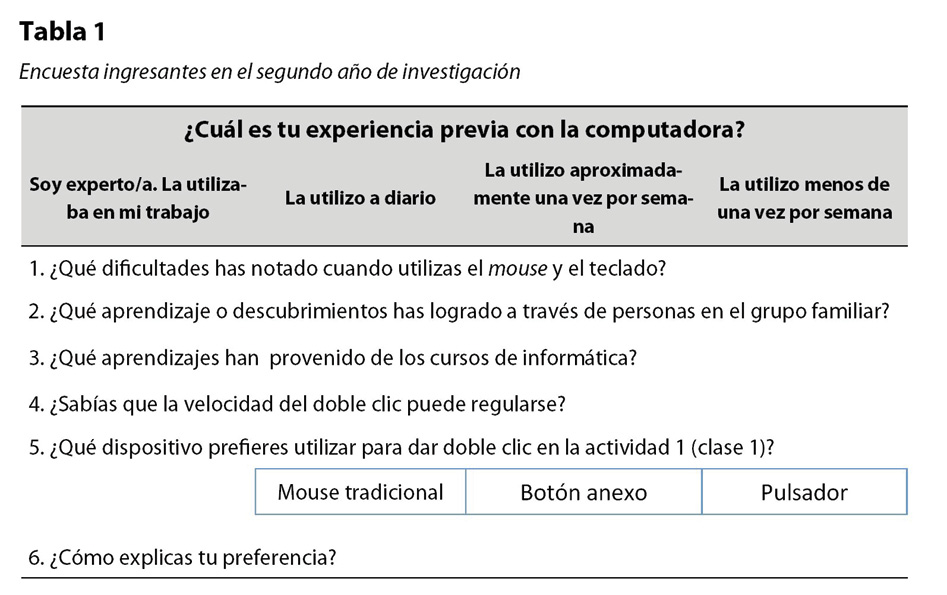 Se realizó un relevamiento exploratorio a lo largo de dos años. Durante el primer año, se evaluó el trabajo de 80 cursantes mayores que ingresaron al taller de informática por primera vez (era su primer año de cursado), distribuidos en grupos de un máximo de 10 personas durante la tarde, en clases de una hora. La evaluación se realizó mediante el uso de un software que detecta la velocidad del doble cliqueo (Mouse Exercises @ SeniorNet.org, s. f.), se registró el desempeño de los 80 estudiantes con la aplicación, en particular, si lograron realizar el doble clic o tuvieron dificultades (uno o más intentos fallidos). Durante el segundo año se evaluó la incorporación de un dispositivo para facilitar el doble cliqueo y la reelaboración de los materiales del taller, con un nuevo grupo ingresante de 92 personas. El coordinador-investigador colaboraba con el dictado de algunos cursos, lo cual le permitió tener contacto con este grupo y observar de cerca sus necesidades.