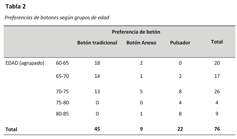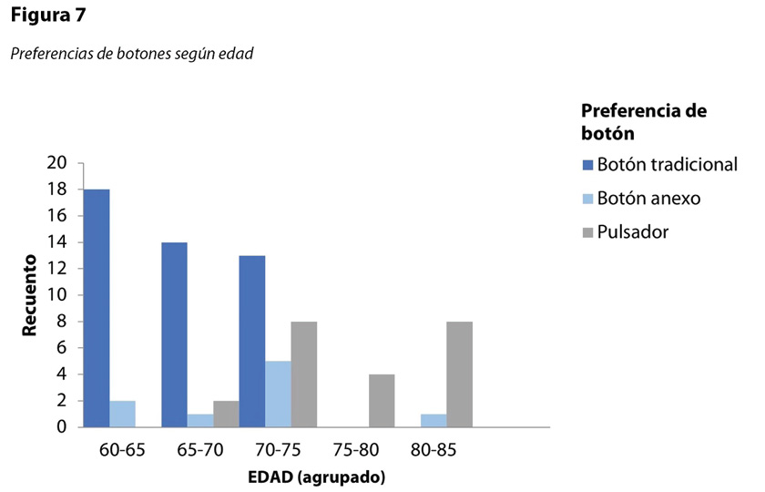 Al agrupar las preferencias (Pregunta 5) en grupos de edad, pudo observarse una tendencia en las personas adultas mayores de 70 años a preferir el uso del pulsador manual en vez del botón tradicional (Tabla 2, Figura 7), mientras que las personas adultas más jóvenes prefieren utilizar el mouse tradicional.