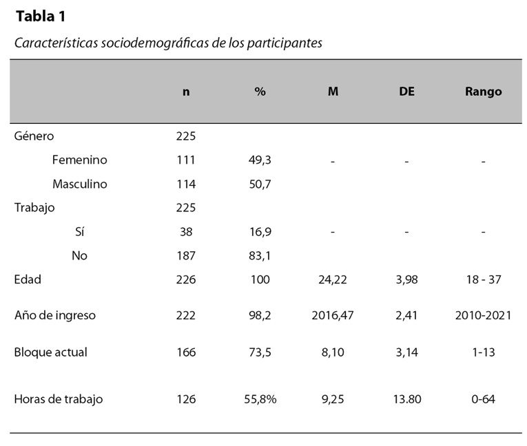 La población en estudio estuvo constituida por estudiantes de Ciencias Médicas de la Universidad de Iberoamérica (ver tabla 1). Se contó con una muestra de 226 estudiantes activos mayores de edad de bachillerato y licenciatura en Medicina y Cirugía, siendo estos los únicos criterios de selección.