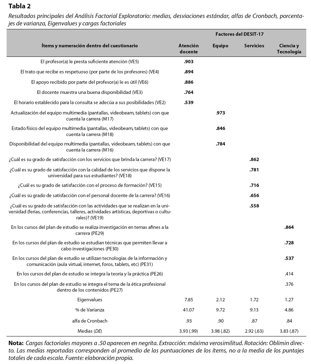 Posteriormente se procedió a realizar un análisis factorial exploratorio con los ítems para agrupar, reducir y construir el instrumento final, eliminando reactivos cuyas cargas factoriales resultaron inferiores a .40 (Williams, et al., 2010; MacCallum et al., 1999; citados por Lloret-Segura et al., 2014) con lo cual se obtuvo el instrumento final, el DESIT-17. El instrumento consta de 17 ítems que miden la satisfacción académica, repartidos en cuatro factores que se detallan más adelante. Se utilizó el método de estimación por máxima verosimilitud con una rotación oblicua ya que se parte de un constructo común (satisfacción académica) con factores relacionados (Lloret-Segura et al., 2014). Seguidamente, se realizaron análisis de consistencia interna mediante el alfa de Cronbach para los factores, así como análisis de correlación y pruebas t de Student. Para todos los análisis efectuados se utilizó el programa estadístico IBM SPSS v. 27.0 (IBM Corp., 2020).