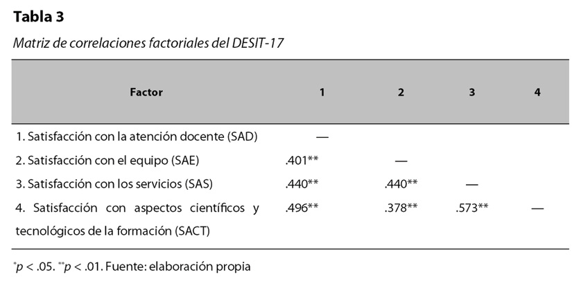El DESIT-17 se relacionó positivamente con sus cuatro factores; satisfacción con la atención docente -SAD- (r = .82, p = “.001”), satisfacción con los servicios -SAS- (r = .77, p = .”001”), satisfacción con el equipo multimedia -SAE- (r = .64, p = .”001”), y satisfacción con aspectos científicos y tecnológicos de la formación -SACT- (r = . 82, p = .”001”). A continuación se presenta la matriz de correlaciones de los factores.