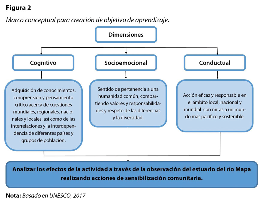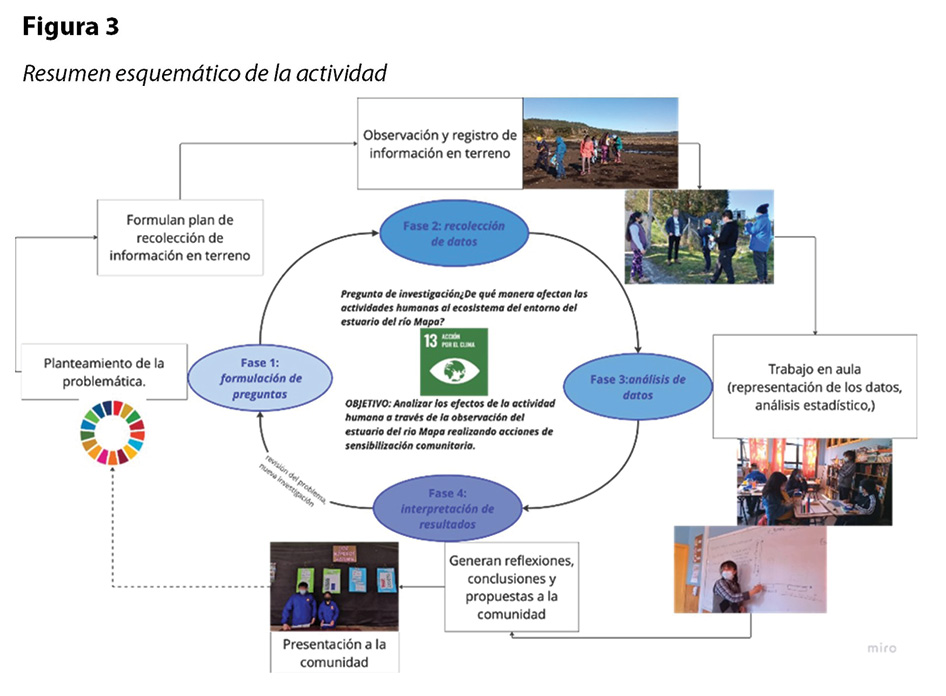 Paso 1, identificación de la problemática: en este caso, la visualización de una problemática sociocientífica (Márquez y Roca, 2006), con alcance local (OCDE, 2017) que tenga relación con alguno de los ODS. En concreto, el grupo de profesoras ha identificado como problemática la contaminación presente en el estuario del río Mapa, que afecta a la flora, fauna y habitantes del sector; ésta se enmarca en el ODS 13 Acción por el clima. Con base en lo expuesto anteriormente, se formula la pregunta movilizadora de la actividad: ¿De qué manera afectan las actividades humanas al ecosistema del entorno del estuario del río Mapa?