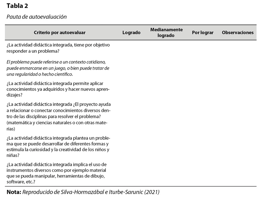 Paso 7, evaluación del diseño: El último paso se realiza una vez terminado el diseño, antes de que sea implementado, para identificar posibles focos de mejora u oportunidades. Para ello, en este caso particular, se ha tomado la propuesta de autoevaluación (tabla 2) con base en los indicadores competenciales de la CREAMAT (2009), diseñada por Silva-Hormazábal e Iturbe-Sarunic (2021). Utilizando esta pauta, se puede valorar la calidad del diseño integrado, por medio de preguntas orientadoras.