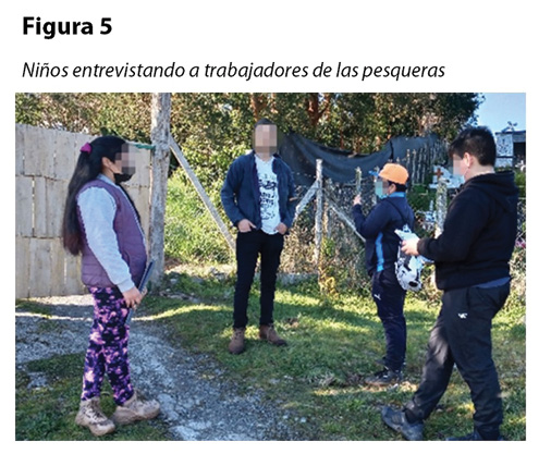 Paralelamente, aplican entrevistas planificadas en la asignatura de lenguaje a habitantes de la comunidad y trabajadores de las pesqueras cercanas, con el propósito de identificar si tienen conciencia de la contaminación que existe y de quién o quiénes son responsables (figura 5). Al analizar las respuestas, el estudiantado concluye que, en ambos casos, las personas no tienen conciencia de la contaminación provocada.