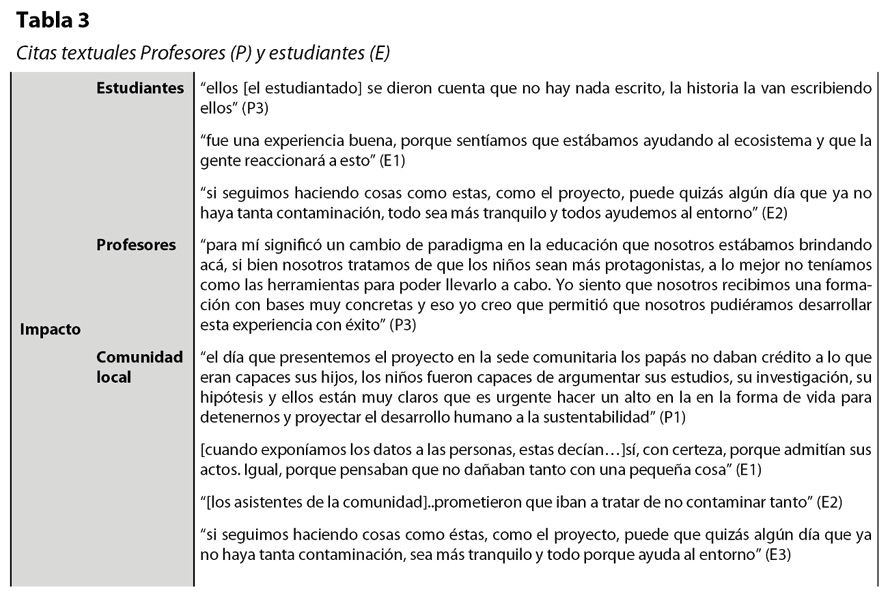 En cuanto a la comunidad local que asiste a la muestra, tanto docentes como estudiantes han evidenciado que estaban impactados, mencionando que “no daban crédito” (P1) a lo realizado por el estudiantado. Al mismo tiempo, se han involucrado identificando sus responsabilidades y compromisos para la mejora de la problemática.
