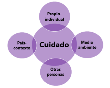 Un eje que se podría decir está en el centro de las ideas anteriores y, por supuesto, se desprende tanto de la transdisciplinariedad como de la ecoformación, es la ética del cuidado. Esta consiste en otorgar al cuidado un lugar central en la vida de las personas, abarcando cuatro ejes que contemplan todos los tipos de relaciones que cada individuo debería atender: el cuidado propio o individual (autocuidado), el cuidado de las otras personas (sus congéneres), el cuidado del país o contexto inmediato, así como el cuidado del medioambiente y todos los seres del planeta, de manera general (Figura 7).
