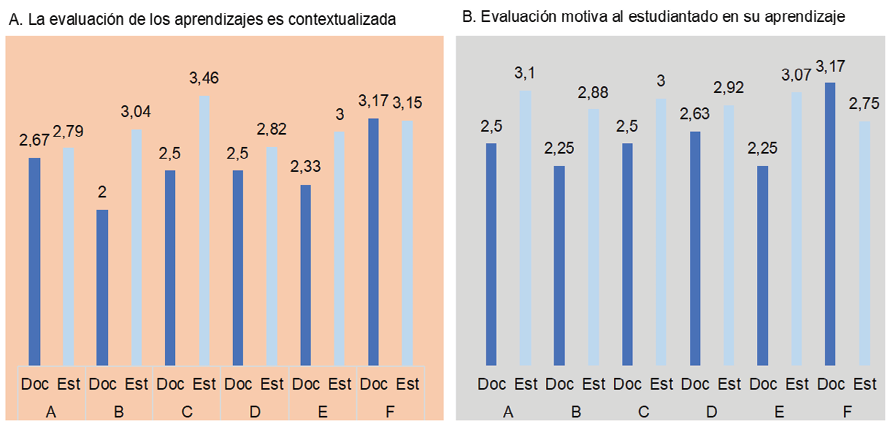 Respecto a la evaluación de los aprendizajes, ambos criterios evidenciaron frecuencias principalmente con tendencia a ubicarse en los rangos del “casi nunca al casi siempre”; esas frecuencias más bajas se observaron en el criterio de la motivación del estudiantado en su evaluación. El puntaje más alto fue otorgado para el estudiantado del colegio C con 3,46 y en docentes, el colegio F apuntó con 3,17. Sobre las frecuencias más bajas, la menor se identificó en docentes del colegio B con un 2 y en estudiantes del colegio A, con 2,79. Si se comparan los datos de todos los criterios evaluados, podría denotarse que esta pareciera ser la que obtuvo las medias más bajas en sus frecuencias en los aspectos valorados.