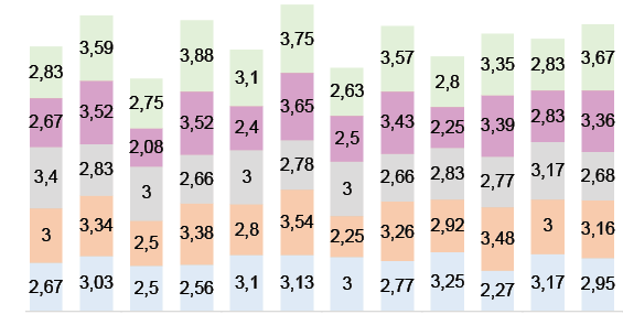 En este contexto, el Reglamento de Evaluación de los Aprendizajes (MEP, 2019), se modificó y se le hicieron ajustes para adecuarse a las circunstancias descritas. La situación anterior varía para el 2022, cuando se regresa a la presencialidad completa y por ende, a la forma de evaluación de los aprendizajes vigente durante el 2019, que implica en las asignaturas académicas básicas, la realización de tareas, pruebas escritas, asistencia y trabajos cotidianos; tomando en cuenta que el estudiantado participante en esta investigación vivió la evaluación del 2019, 2020, 2021, 2022 y ahora la del 2023, tienen una experiencia amplia para referirse a estos criterios y de ahí los puntajes obtenidos que en general son levemente más bajos que para el cuerpo docente aunque para estudiantes, también las frecuencias son bajas.