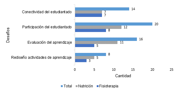 Los principales desafíos señalados a través de la encuesta autoadministrada en línea estuvieron relacionados con los aspectos de la didáctica, específicamente, el rediseño de las actividades de aprendizaje y su evaluación; por otro lado, los componentes del estudiantado referentes a su participación en el curso y problemas de conectividad (ver tabla 2).