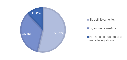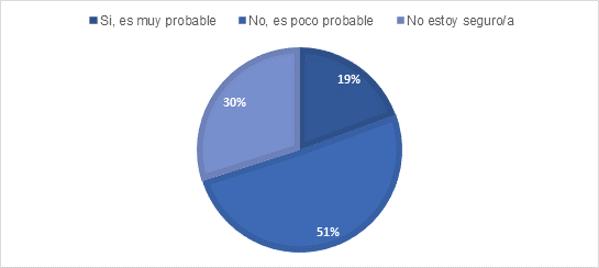 En relación con este tema, De Ibarrola (2016) propone destacar competencias en lugar de certificados escolares, lo que permitiría identificar el: "grado de dominio de las capacidades, los conocimientos y las habilidades para el trabajo, independientemente de dónde se hubieran adquirido" (p. 75). Refiriéndose a la pregunta 6, el 50,7% contestaron que es poco probable que la IA pudiera reemplazar completamente la labor docente en el futuro, mientras que un 30% exteriorizó no estar seguro de esta respuesta. El porcentaje restante fue de una menor parte, el 19% reveló que sí era muy posible que la IA remplazara completamente al personal docente en el futuro.