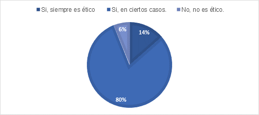 La figura 4 muestra que el 80,3% de las personas encuestadas consideró que su uso era ético en el quehacer educativo solo en algunos casos. Solo un pequeño porcentaje, el 5,7%, consideró que no era ético, mientras que el 13,6% opinó que sí era ético siempre.