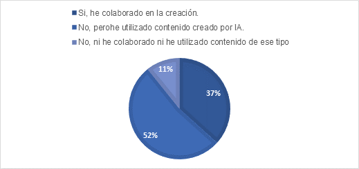Por otra parte, según se muestra en la figura 5, el 52% de las personas encuestadas afirmó que no han colaborado ni utilizado este tipo de contenido. Por otro lado, un 37% indica que no han colaborado en la creación de dicho contenido, pero sí han utilizado material generado por IA. Finalmente, el 11% restante sí ha participado en la creación de este tipo de contenidos educativos. Esto refleja que una minoría ha estado directamente involucrada en la generación de materiales educativos con IA.