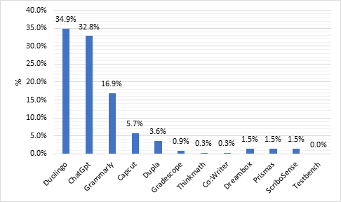 En la figura 10, se identificaron las herramientas, sitios web o aplicaciones que fueron utilizadas para aprovechar la IA en el ámbito educativo. Según las respuestas recopiladas, las herramientas de IA más populares y ampliamente utilizadas en el ámbito educativo fueron Duolingo ® y Grammarly ®. Otras, en cambio, fueron menos conocidas o apenas utilizadas por las personas encuestadas.