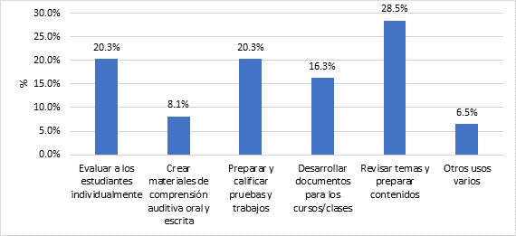 · Evaluar a las personas estudiantes individualmente: 20,3% expresaron interés en utilizar la IA para brindar evaluaciones personalizadas, adaptadas a las necesidades y habilidades de cada estudiante. Creen que esto ahorrará tiempo en la revisión y brindará comentarios más personalizados.