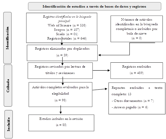 En este estudio, se aplicó el modelo de revisión sistemática de la literatura de acuerdo con los estándares propuestos por la Declaración PRISMA (Preferred Reporting Items for Systematic Reviews and Meta-Analyses) (Page et al., 2021). Por lo tanto, se propone identificar, seleccionar y extraer datos basados en un proceso riguroso y sistemático (Moraga y Cartes – Velásquez, 2015), en el que se identificaron tres etapas: identificación, cribado e incluido de los trabajos seleccionados (ver figura 1).