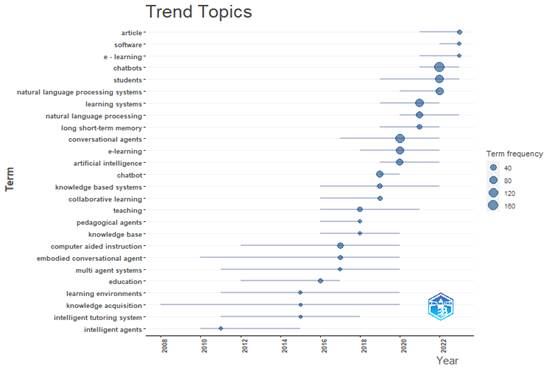 En cuanto a los trending topics (ver Figura 6), destacan, desde 2008, términos como knowledge acquisitior, intelligent tutoring system, intelligent agents y embodied conversational agent. En la actualidad sobresalen términos como article, software, e-learning, chatbots, students y natural language processing systems. Estas palabras clave sugieren un enfoque en la intersección entre la educación en línea, la tecnología y la comunicación con estudiantes. El análisis indica la presencia de herramientas tecnológicas en la educación en línea, mientras que los chatbots y los sistemas de procesamiento del lenguaje natural implican la mejora de la interacción y la comunicación en este contexto. Por ejemplo, el “aprendizaje profundo” y el “aprendizaje automático” son fundamentales para que los chatbots sean capaces de comprender y generar texto de manera efectiva (Io & Lee, 2017). La inteligencia artificial es el campo general que engloba estas tecnologías digitales. Los resultados sugieren un enfoque actual en la convergencia de la educación en línea, la tecnología y la comunicación con estudiantes, donde las herramientas tecnológicas, como los chatbots y los sistemas de procesamiento del lenguaje natural, desempeñan un papel fundamental, respaldados por avances en inteligencia artificial.