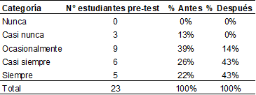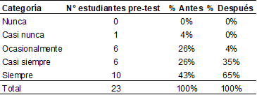 La tabla 2 revela un incremento significativo en el porcentaje de estudiantes que perciben que se llevan a cabo preguntas de reflexión sobre las mejoras del escrito. En particular, se observa que el 61% de las personas estudiantes ahora califican esta práctica como "siempre", en comparación con solo el 26% antes de la intervención. Este aumento del 35% indica un cambio positivo en la percepción de estudiantes sobre la atención y el énfasis que se pone en la reflexión y mejora de sus trabajos escritos. Este hallazgo sugiere que la intervención implementada ha tenido un impacto significativo en la valoración de estudiantes hacia el proceso de revisión y retroalimentación en sus trabajos: