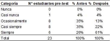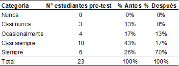 A continuación, se procedió a realizar un análisis descriptivo de los resultados de la encuesta. La tabla 1 revela que, después de la intervención, el 65% de las personas estudiantes indicaron que se les proporciona una explicación cuando tienen dificultades para comprender, en comparación con el porcentaje registrado antes de la intervención. Este hallazgo sugiere un cambio significativo en la percepción del estudiantado respecto al apoyo recibido en el proceso de aprendizaje.