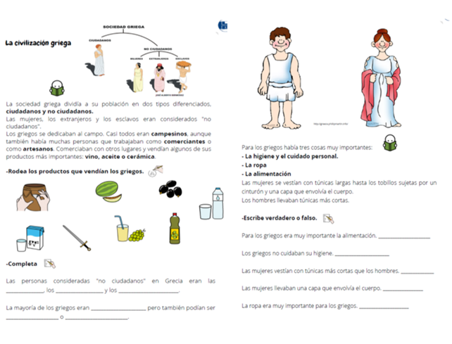 Posteriormente, se trabaja el tema de la sociedad griega y se aborda desde la organización de la población, los considerados ciudadanos y no ciudadanos, así como las características de la sociedad y su tipo de alimentación. Finalmente, se aborda el tema sobre los tres elementos fundamentales de los griegos: higiene y cuidado personal; ropa y alimentación. Por medio de los temas presentados, las personas estudiantes deben completar actividades de opción múltiple, verdadero o falso y completar oraciones.