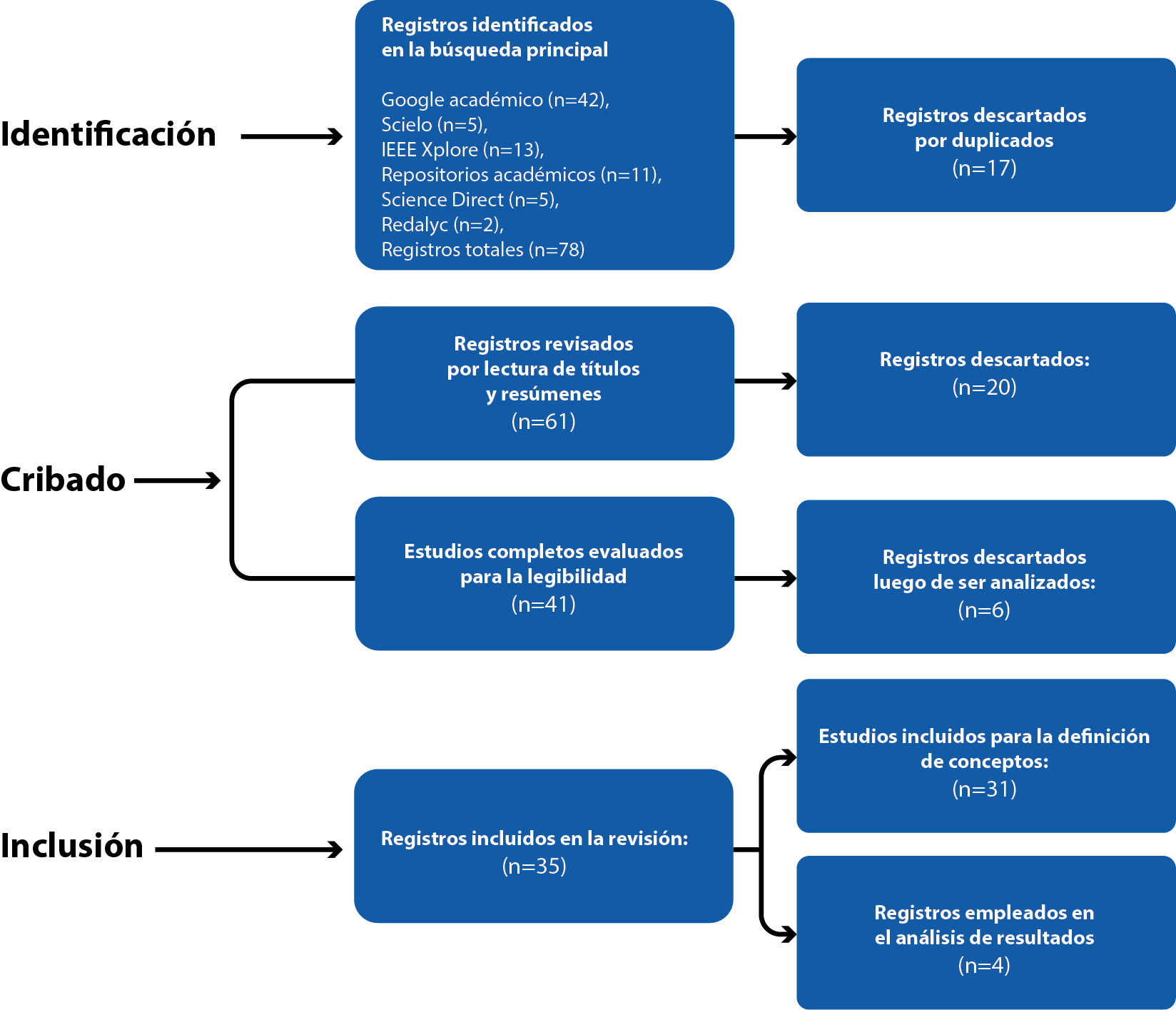 Etapa 3: Inclusión. De cada publicación seleccionada, se extrajeron y sintetizaron datos y resultados relevantes de acuerdo con el propósito de la investigación. Se incluyeron un total de 34 estudios, de los cuales 30 fueron utilizados para la descripción de conceptos y cuatro, en la discusión de resultados.