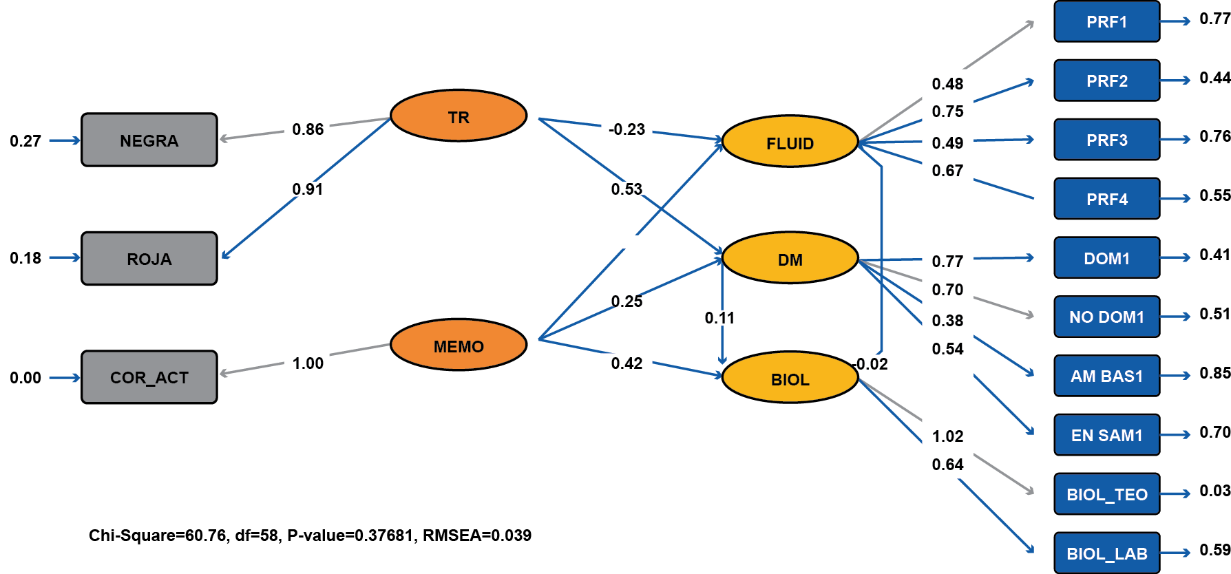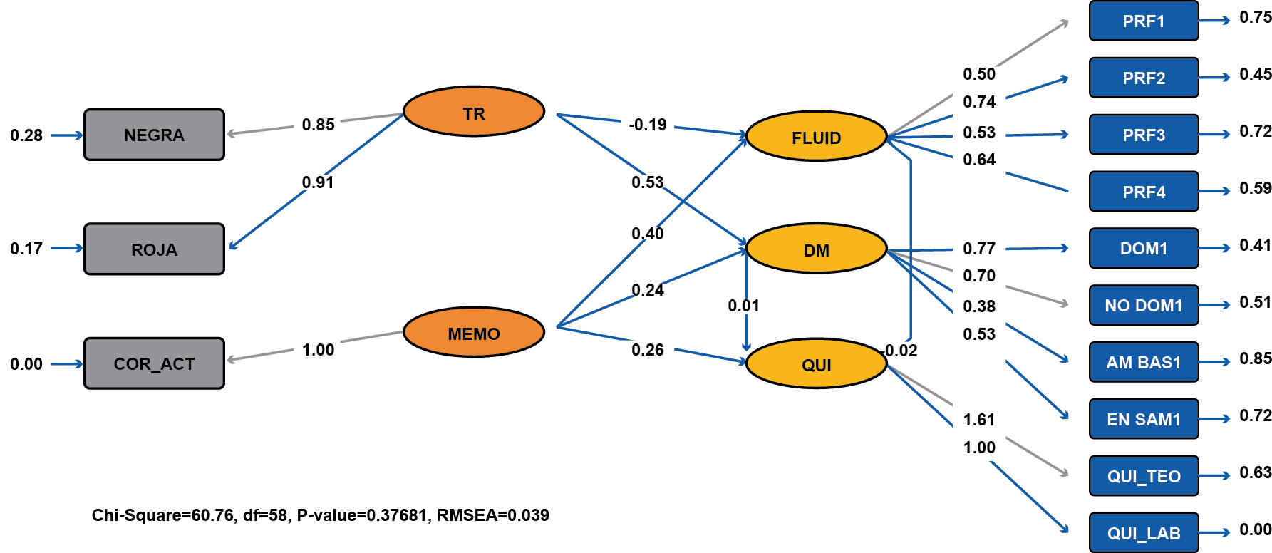 Nota. RMSEA= 0,039; Non-Normed Fit Index (NNFI) = 0,70; Comparative Fit Index (CFI) = 0,77; Standardized RMR = 0,12; Goodness of Fit Index (GFI) = 0,77; Adjusted Goodness of Fit Index (AGFI) = 0,65.