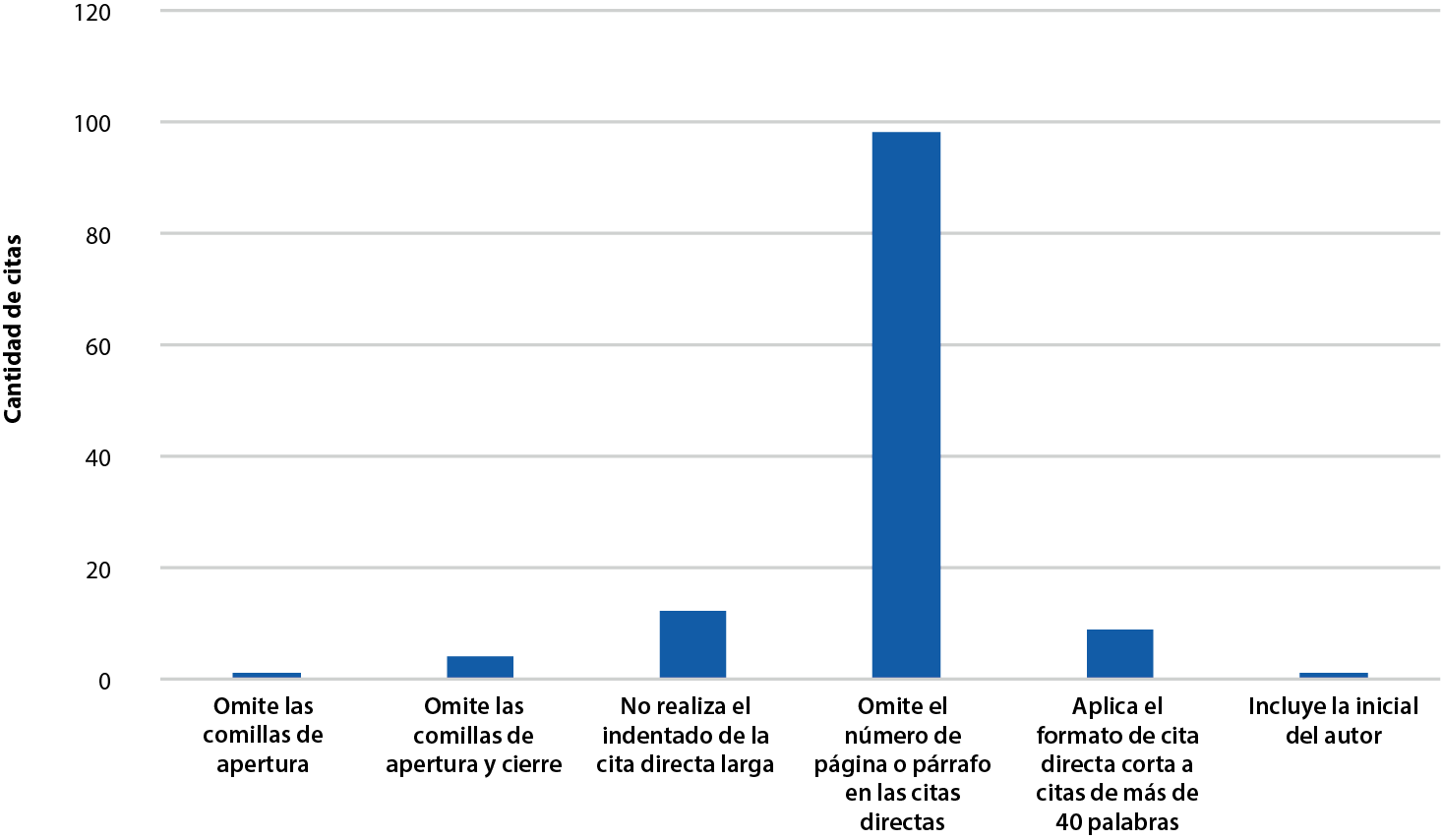 Por otra parte, en torno a la inconsistencia de formato y a las debilidades, el problema más significativo está relacionado con la citación directa en formato APA (sétima versión), pues se identificó a la omisión del número de página en citas literales en 98 ocasiones; seguido de no realizar el indentado de la cita larga (12); y, en tercer lugar, la aplicación del formato de cita corta a citas de más de 40 palabras (9).