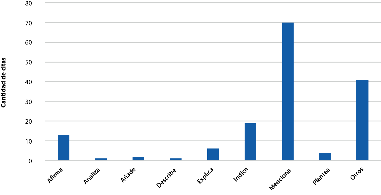 El escenario anterior es similar al caso de las citas con autoría en función de sujeto, pero en este caso con los verbos utilizados. La variedad léxica es poca y se limita mayormente al verbo “mencionar” en construcciones como “X menciona que”. Otros verbos que se repiten son “indica” (19) y “afirma” (13).