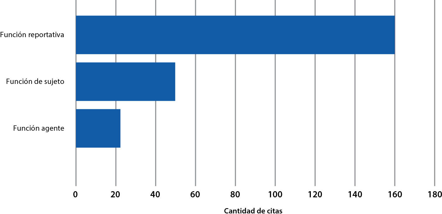 Dentro de las citas integrales, están las que incluyen la autoría en función reportativa, esto es cuando se recurre a locuciones tales como “según X”, “de acuerdo con X”, “como señala X”, entre otras, lo cual representó el uso más extendido para los casos estudiados (161). A continuación, se encuentra aquella que se introduce colocando la autoría en función de sujeto (“X apunta que”), con un total de 150 citas. Y, finalmente, la autoría en función de agente, que son del tipo “el tema X ha sido estudiado por X”, a la que corresponde 39 citas del total (ver Figura 2).