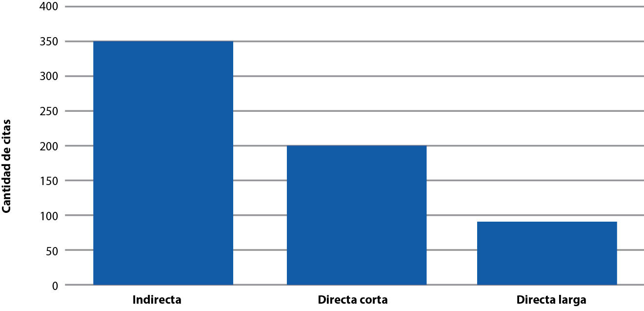 En el análisis de las citas directas, se identificaron las cortas y las largas tanto en su redacción narrativa como de modo paréntesis. Al respecto, se distinguió que la más frecuente es la cita directa corta con mención del autor, 122 (narrativa); le sigue la larga, con una repetición de 57. Las citas largas comparten el comportamiento anterior en términos de redacción, dado que de las 95 citas largas, el 60 % se escribió de manera narrativa y las demás en paréntesis. Respecto de la cita directa, llama la atención que esta última no se haya situado en primer lugar, debido a que, por sus características y a la precisión que conlleva su uso, no implica más esfuerzo que no sea trasladarla de un documento a otro, sin mayor modificación, lo cual se constituye en un proceso más sencillo.