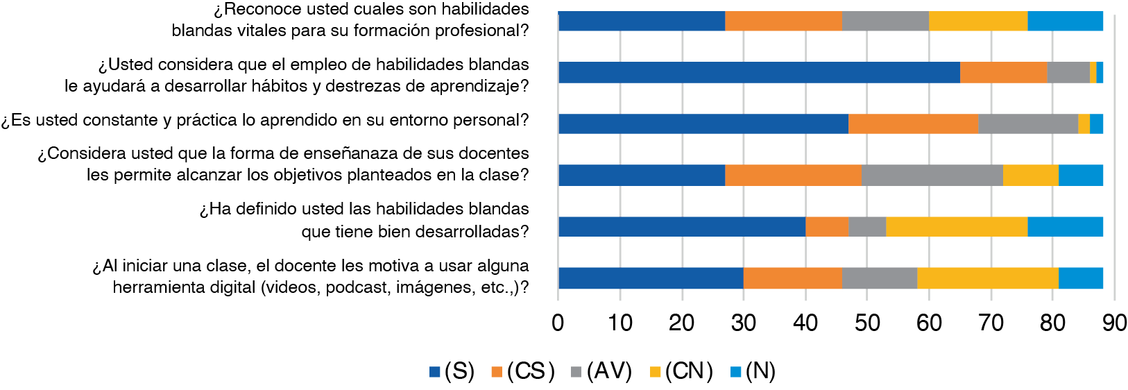 Las habilidades blandas que se desarrollan desde la formación básica deben continuar en la educación superior, ya que facilitan el proceso de inmersión laboral de los recién egresados; sin embargo, un aspecto interesante radica en la falencia encontrada en este estudio sobre la habilidad de conciliación y de plantear preguntas (p. 58).