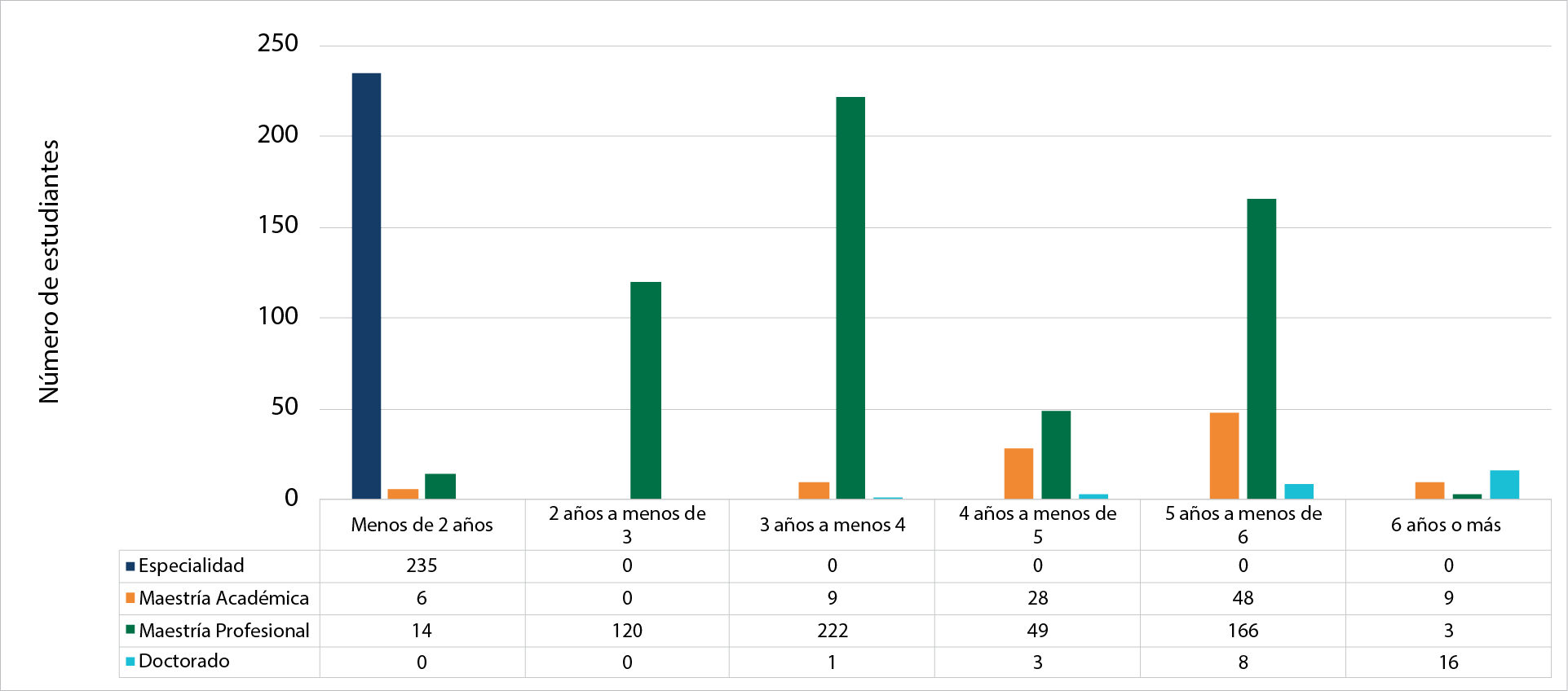 Por su parte, el Convenio sobre la nomenclatura de grados y títulos de la educación superior universitaria estatal establece duraciones promedio para los grados de especialidad profesional (mínimo 2 ciclos de 15 semanas), maestría profesional y académica, así como el doctorado (mínimo 4 ciclos de 15 semanas) (Consejo Universitario, 2004). Sin embargo, estas varían sustancialmente dependiendo del número de créditos académicos de los planes de estudio.