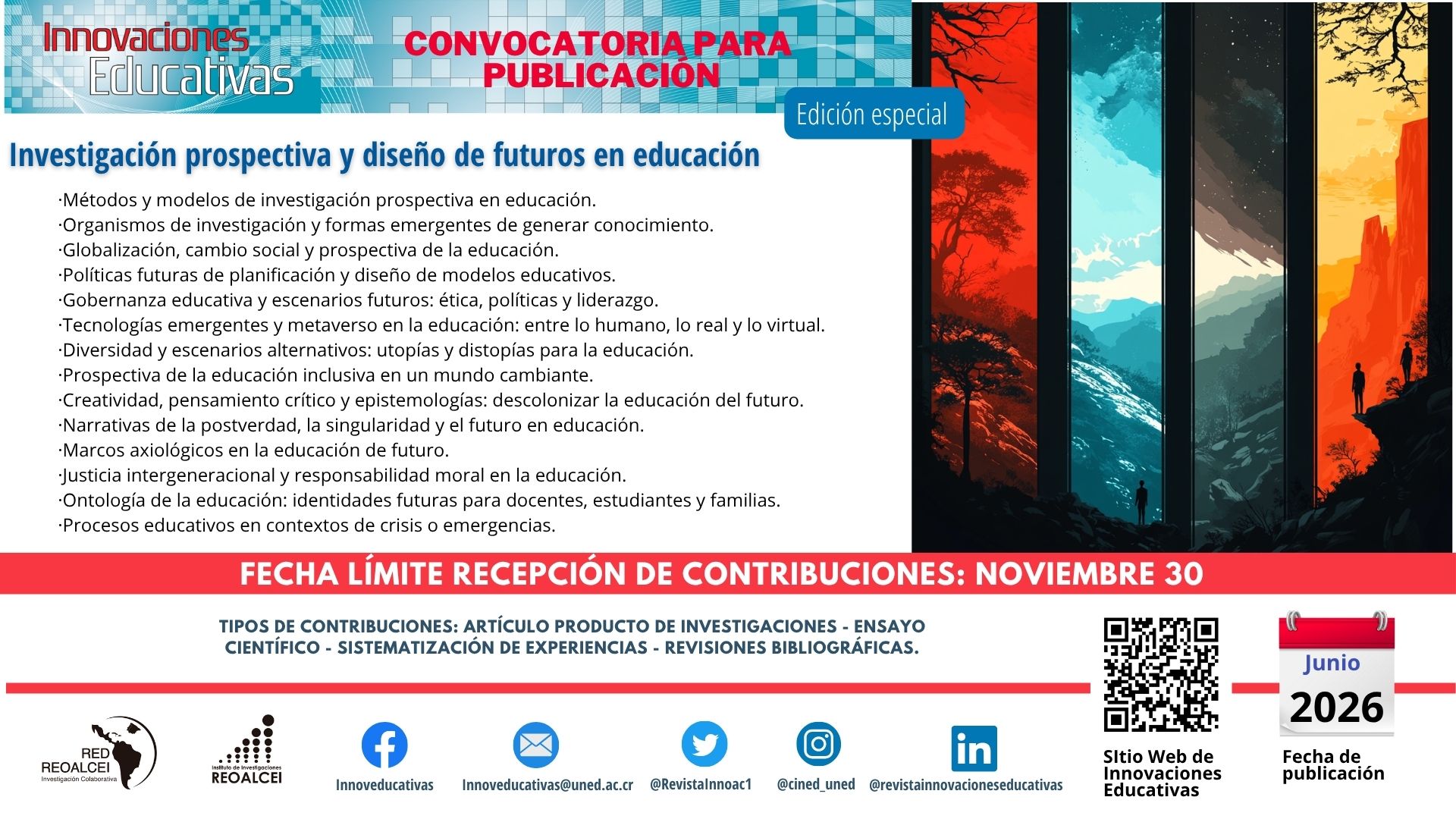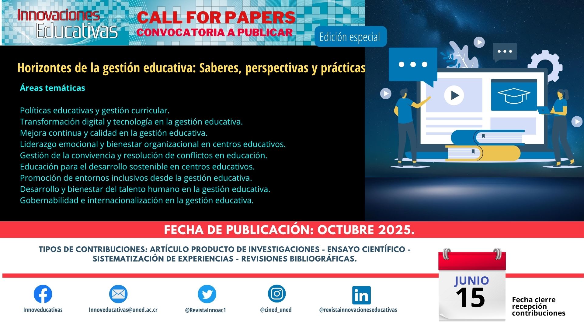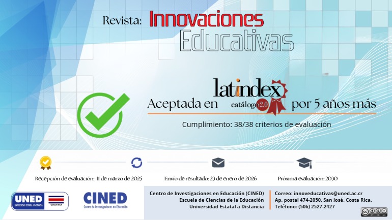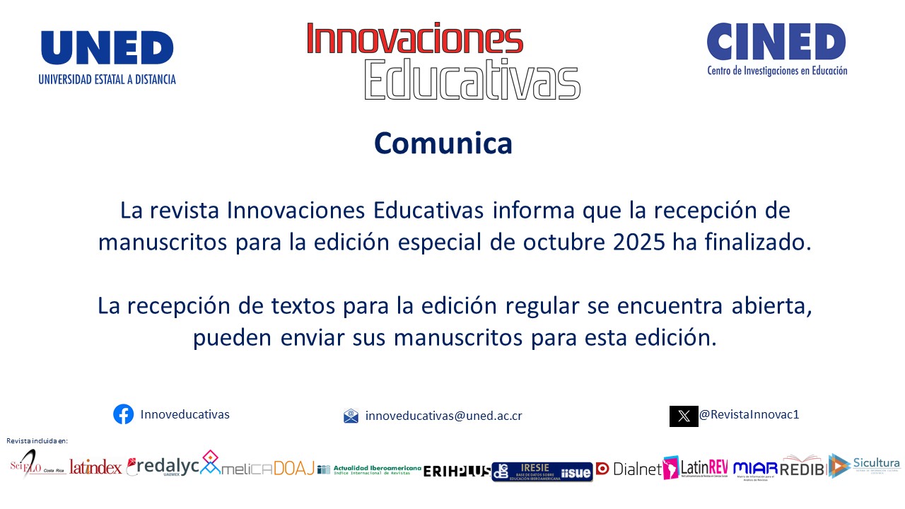 Para más información, es posible visitar el sitio web de "Innovaciones Educativas" en https://revistas.uned.ac.cr/index.php/innovaciones o contactar al equipo por medio de a las redes sociales de la revista.