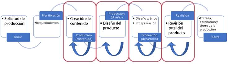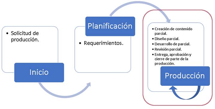 En lo que respecta al proceso de producción, en ambas universidades se establece un procedimiento claro que debe seguir quien desee un laboratorio virtual, en la UPM, el proceso de resume en tres etapas, siendo la tercera un ciclo con diversas etapas y que se repite hasta que se termina la producción. El proceso en la UNED es más seccionado, ya que contempla fases dedicadas a aspectos muy puntuales en la producción.