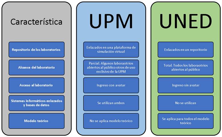 En la figura 3, se evidencian las características de los laboratorios de la UPM y la UNED.