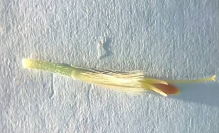 Hacia el borde del receptáculo se disponen las flores conocidas como ‘‘ray’’, las cuales poseen una lígula muy vistosa y altamente desarrollada que es el resultado de la fusión de 3 pétalos y además cuentan con dos pétalos libres poco desarrollados (Bremer 1994). Son femeninas debido a que los estambres abortan durante el desarrollo de la flor y solo quedan dos remanentes de estos, muy poco visibles, con la apariencia de dos delgados hilos (Figura 2).