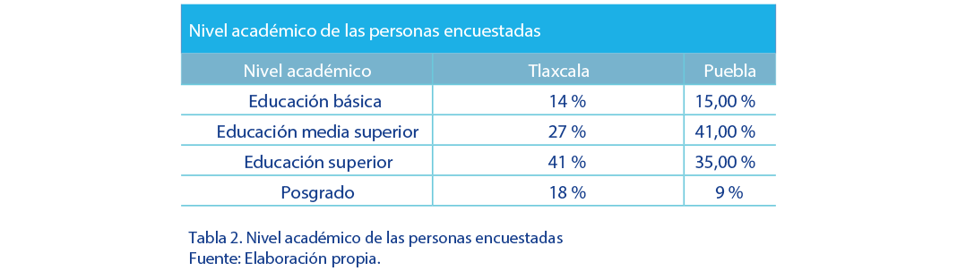 La tabla anterior muestra que el nivel académico que predomina en los encuestados es la educación superior en Tlaxcala, con 41 %, y en Puebla la educación media superior, con un 41 %, lo cual refleja que la mayor cantidad de personas empresarias cuenta al menos con la educación del nivel medio superior y buscan seguir preparándose a través de una licenciatura o posgrado. |